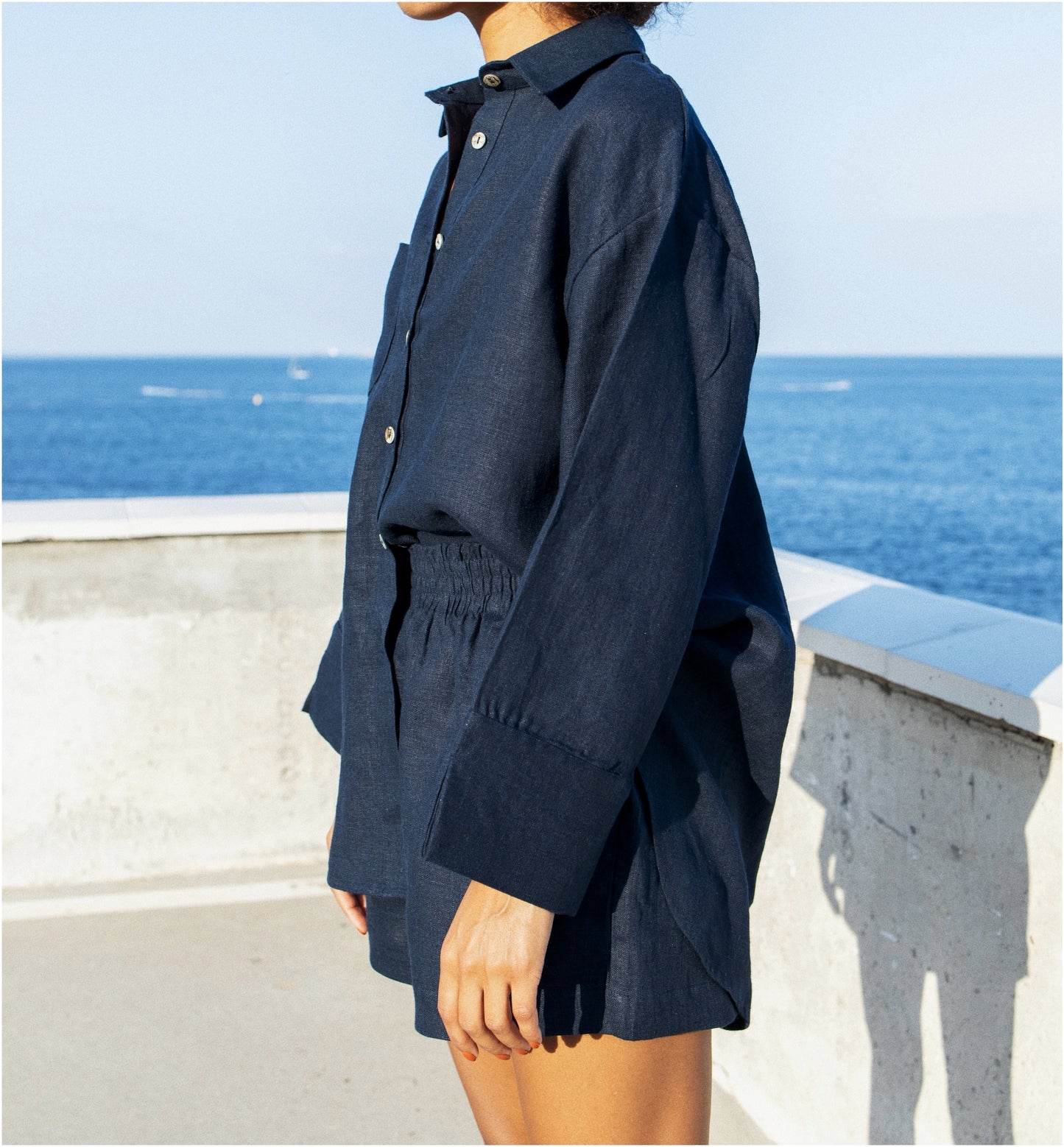 Stay cool and comfortable in our Summer Set which features pull-on style shorts and a button-down shirt with an oversized silhouette.